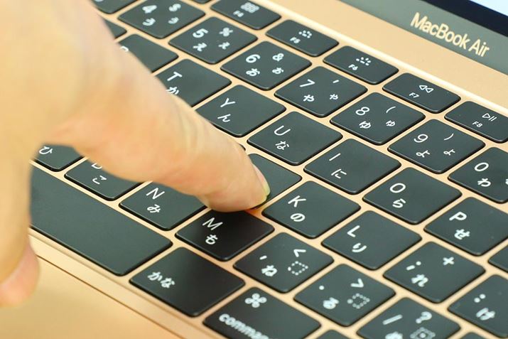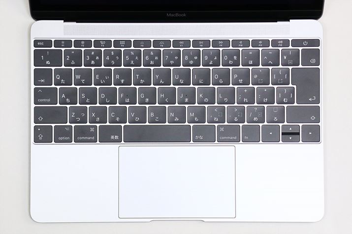 MacBookのキーボードは旧世代で、ほかのモデルと比べるとストロークの浅さが気になります。打鍵音もカチカチと高い音がします。本体は小さいですが、キーレイアウトには余裕があり窮屈な感じはしません