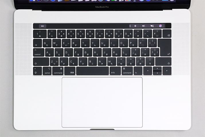 MacBook Pro 15インチモデル。最新世代のキーボードですが、MacBook Pro 13インチモデル(Touch Barあり)やMacBook Airと比べると、少しペタペタした打ち心地です