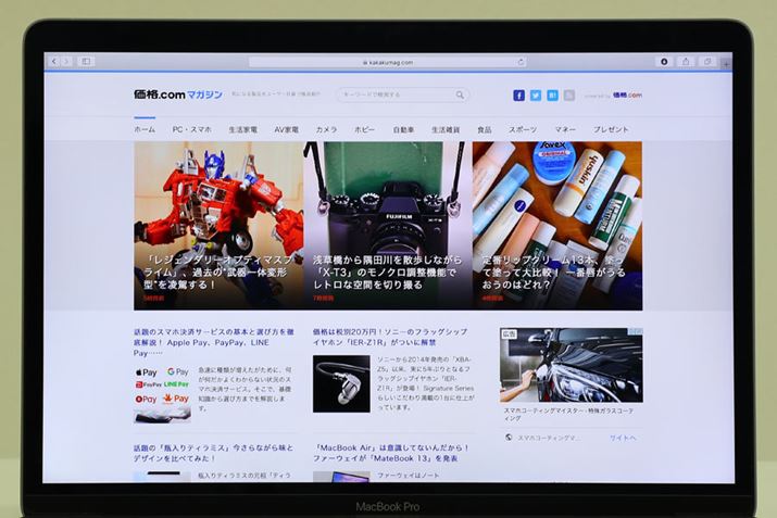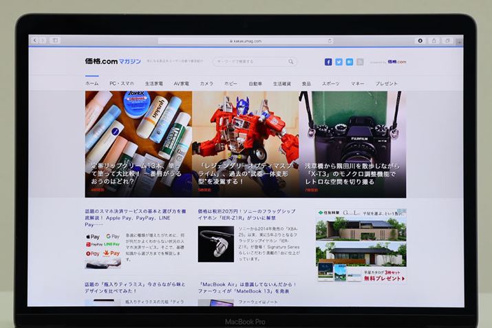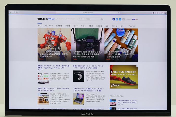画面サイズを気にする人も多いでしょう。特に、MacBookの12型とMacBook AirやMacBook Proの13.3型の違いは、数字以上に違います。12型よりも13.3型のほうがデスクトップに余裕があり、作業効率は高まるはずです。説明不要ですが、MacBook Pro 15インチモデルの15.4型は、さらにデスクトップが広々としています。パレットやツールを複数表示して作業する写真や動画の編集をしたいという人には、MacBook Pro 15インチモデルをおすすめします。