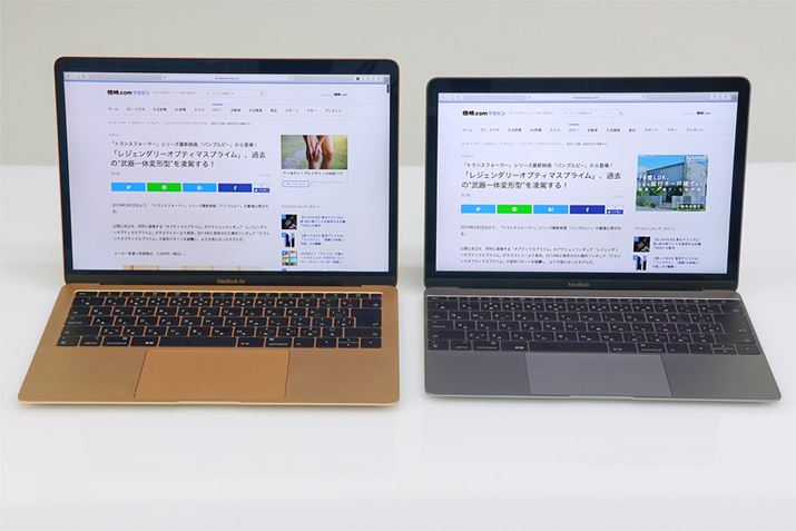 左が13.3型のMacBook Air、右が12型のMacBook。アスペクト比は16:10で同じです。比べてみると、数字以上にMacBook Airの画面のほうが大きく見えます