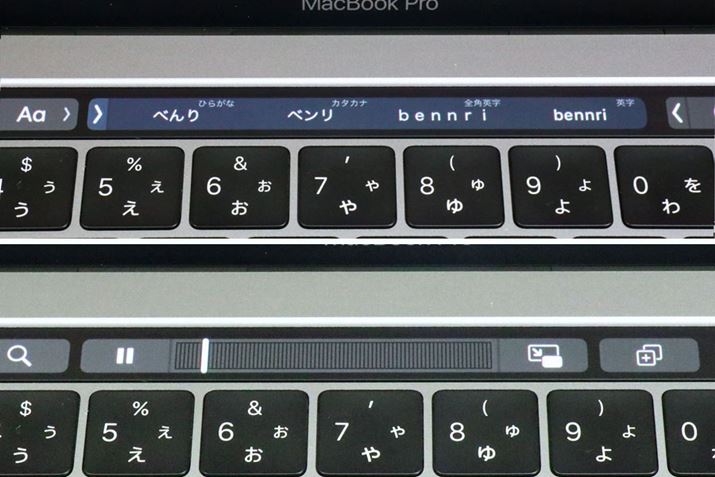 MacBook ProのTouch Barは、ファンクションキー部分に埋め込まれたタッチ操作対応のディスプレイ。アプリケーションによって表示が変わり、さまざまな使い方ができます。文字の入力中なら変換候補、動画再生中ならシークバー、画像編集中なら各種ツールが表示されます。慣れは必要ですが、作業の効率化につながる機能と言えるでしょう。