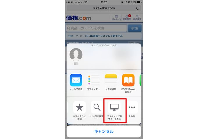 「↑」ボタンをタップし、「デスクトップ用サイトを表示」をタップすれば、デスクトップ用のWebページが表示される。これは普通のやり方