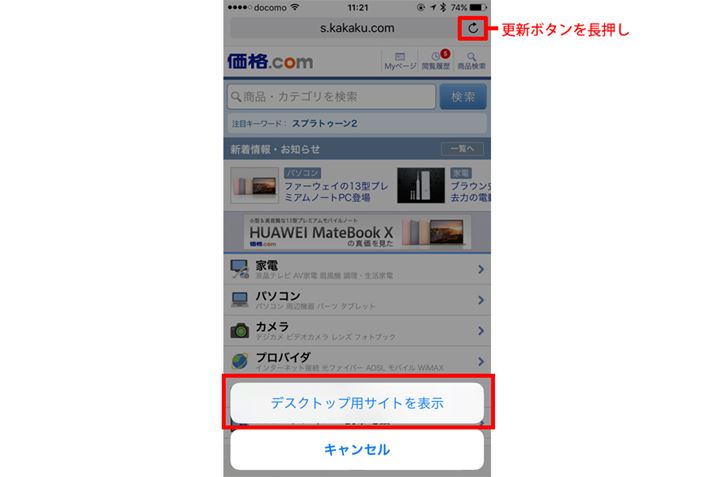最近は、デスクトップ(パソコン)用とスマートフォン用でWebページの見え方を変えるのが一般的だ。価格.comはもちろん、「Yahoo! JAPAN」や「NHKオンライン」、各種新聞系のWebページもシンプルなスマートフォン用ページを用意している。スマートフォンでデスクトップ用のWebぺージを見たい場合、画面下部の「↑」ボタンを押して、「デスクトップ用サイトを表示」をタップするのが普通のやり方だ。この方法以外に、もっと素早くデスクトップ用サイトを表示する方法がある。アドレスバーの右にある更新ボタンを長押しする方法だ。デスクトップ用のWebページをスマートフォンでよくチェックするという人は覚えておいて損はない。