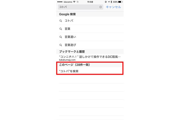 アドレスバーにキーワードを入力し、下に表示される「このページ」という部分をタップするとページ内をキーワード検索できる。これは昔からある方法