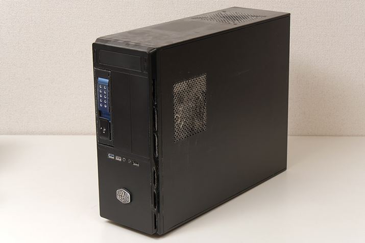 今回掃除する我が家の自作PC(ほぼファイルサーバー化してる古いマシン)。PCケースはATX対応のミニタワー型、COOLER MASTER「ELITE 361」。本体サイズは150(幅)×368(高さ)×464(奥行)mmとコンパクトなので、内部を掃除するのはやや面倒だ