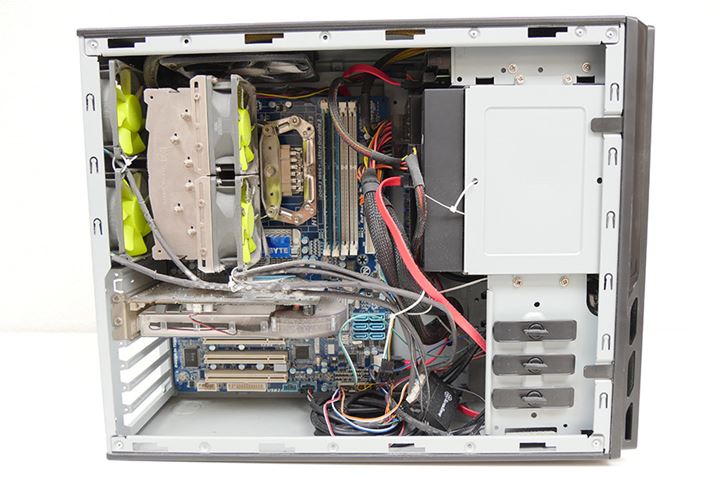 PCケースを開けてみたところ、想像よりきれいだったが、ケーブルやグラフィックカードなどの細部を見るとホコリの付着が目立っていた
