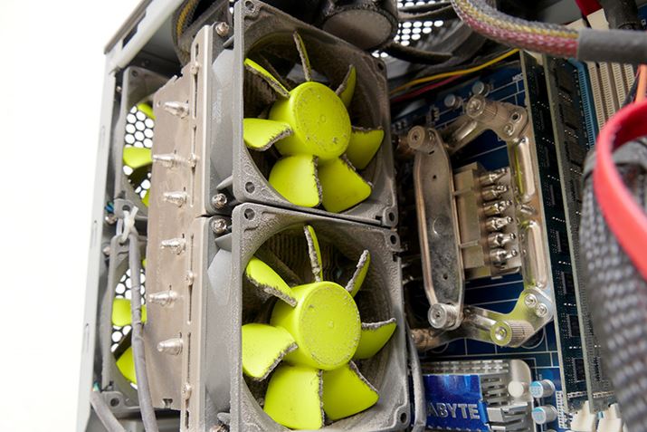 清掃前のCPUクーラー。いたるところにホコリがへばり付いている。使用しているCPUクーラーはSilverStone「NT01-PRO」で、搭載されている80mmファン2基はこの状態では取り外せない