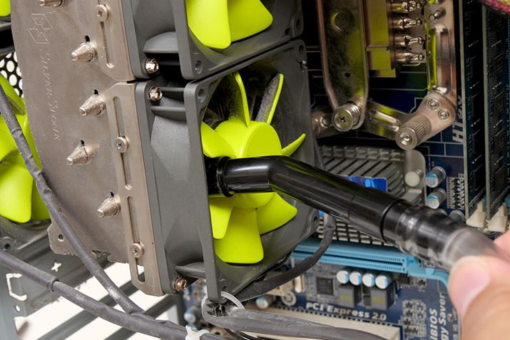 手が届かないCPUクーラーのフィンブロックとファンの間にたまっているホコリは、羽根の隙間からノズルをもぐりこませて吸い取る。これだけでも案外きれいになる