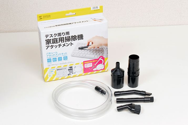 次は各種接続ポートなどにたまっているホコリの除去だ。このホコリを取るときに重宝するのがサンワサプライのバキュームアタッチメントキット。マキタのフレキシブルホースを経由して掃除機とつなぐ。
