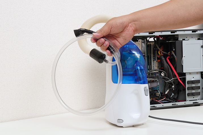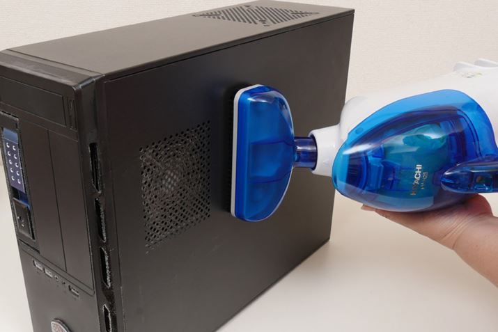 ケーブルを外し終えたらケース全体に積もっているホコリを掃除機で吸い取る。ここら辺は大ざっぱにやっても問題ないので、掃除機に付属している標準ブラシでガーッと吸い取ろう(最近では強化ガラスを採用したケースもあるので、こういうものは除電ブラシなどで掃き取るとよい)。