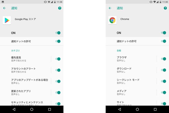 左が「Google Play ストア」アプリ、右は「Chrome」の通知項目。通知する内容が細分化されており、必要なものだけを通知できるようになった