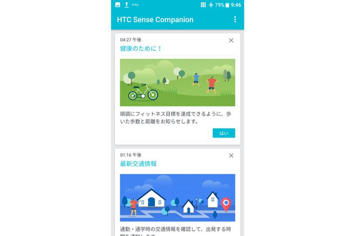 本機は1440×2560表示に対応する約5.5インチの液晶ディスプレイを搭載しており、画面サイズに余裕がありつつ、画面解像度も高い。豊富なAI機能も特徴で、HTC独自のAIレコメンド機能「Sense Companion(センスコンパニオン)」では、ユーザーの利用状況や端末の状況を解析して、使わないアプリを自動で停止したり、地図アプリのルート案内を行う際に交通状況を考慮したり、ユーザーの好みを理解したレストラン案内などが利用できる。なお、Sense Companion はAmazonのAI技術「Amazon Alexa」にも対応している。もちろん、Google標準の「Google Assistant」にも対応しており、合計3種類のAI技術を利用できる。