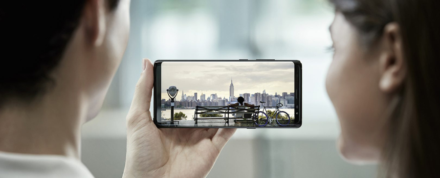 Galaxy Note 8は、約6.3インチの大画面ディスプレイを搭載するスマートフォン。国内でも好評の「Galaxy S8/S8+」と同じ、ほぼベゼルレスの「Infinity Display」を採用することで、大画面でありながら、手に収まるサイズ感を実現している。画面のアスペクト比は18.5:9。解像度は2960×1440のQHD+だが、表示解像度は初期設定がフルHD+となっている。