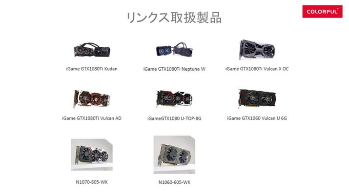 リンクスインターナショナルが取り扱うビデオカード第1弾製品は、「iGame GTX1080Ti Kudan」「iGame GTX1080Ti Neptune W」「iGame GTX1080Ti Vulcan X OC」「iGame GTX1080Ti Vulcan AD」「iGameGTX1080 U-TOP-8G」「iGame GTX1060 Vulcan U 6G」「N1070-805-WK」「N1060-605-WK」の全8モデルだ