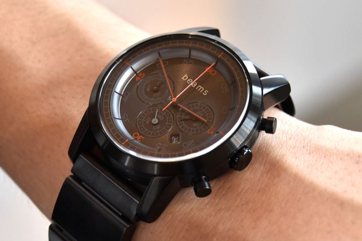「beams Black」シリーズは、オレンジをポイントカラーにしたフェイスや、ヘッド裏蓋の「a new spec beams」コンセプトロゴの刻印を第1弾モデルから踏襲。いっぽうで、第1弾モデルから印象を変えるため、たとえば「Chronograph Premium Black BD beams edition」の場合、時針、分針にオレンジのラインを施した。ちなみに秒針は、どのモデルもすべてオレンジを採用している。