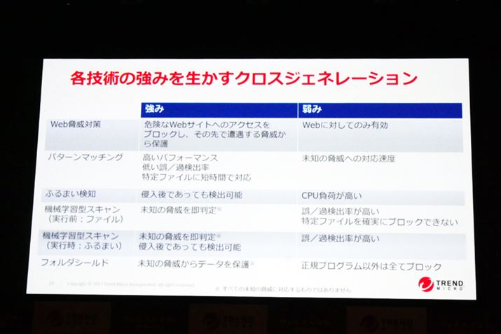 こういった亜種や未知の脅威に対応すべく、トレンドマイクロが最新版「ウイルスバスター クラウド」に新しく導入したのが「XGen」という防御システムだ。1日約30万件の脅威検出数、1日2億件以上の脅威ブロック数などから得たビッグデータをAIに学習させ、亜種や未知なる脅威をプログラム実行前に判別することが可能だという。