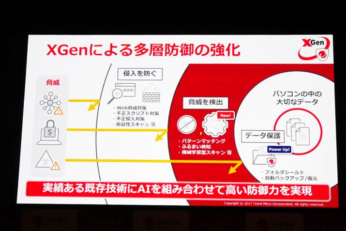 「XGen」は、既存の技術で脅威の侵入を防ぎ、侵入された後は機械学習型スキャンやパターンマッチングで脅威を検出。さらには、ユーザーの大事なデータをランサムウェアによる暗号化から保護する「フォルダシールド」機能を強化。つまり、3段階での多層防御を実現し、増え続ける脅威に対抗するというわけだ。