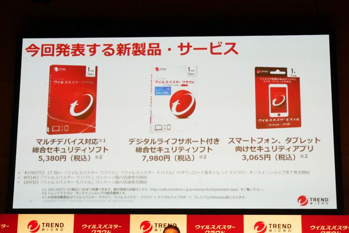 「ウイルスバスター クラウド」は、1年版が5,380円、2年版が9,680円、3年版が12,780円。これに、24時間365日サポート対応するサービス「デジタルライフサポート プレミアム」が付与されたモデルも発売され、1年版が7,980円、2年版が13,800円、3年版が18,580円となっている。ダウンロード版はすでに販売中で、パッケージ版は10月5日から発売。