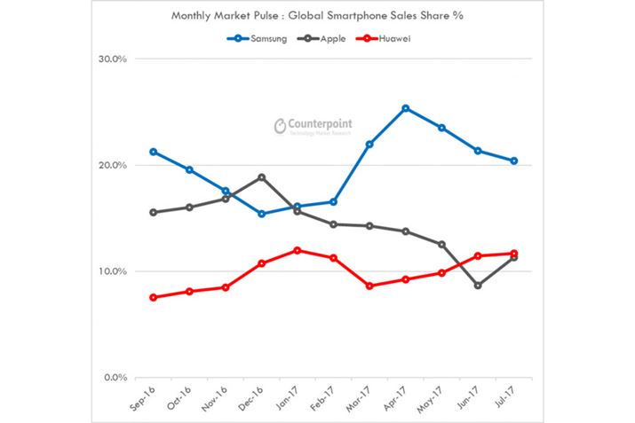市場調査会社のCouterPointが、各スマートフォンメーカーの2016年9月から7月における全世界の販売台数データを公開。中国のファーウェイが2017年6月と7月にアップルを抜いて、第2位になったことが明らかになりました。