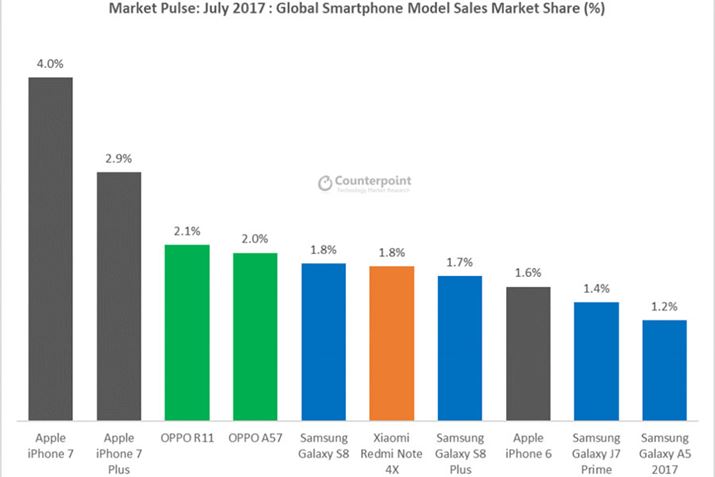 2017年7月におけるスマートフォンのモデル別シェアトップ10。アップルとサムスンのほかには、OPPOやXiaomiのスマートフォンがランクイン