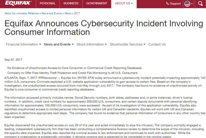 Equifaxの発表によれば、ウェブサイトの脆弱性をついた不正アクセスが確認され、ユーザーの氏名/社会保障番号/生年月日/住所/社会保障番号が盗み出されたとのこと。さらに、20万9000人分のクレジットカード番号や、18万2000人分の個人情報が記載された書類が流出したとしています。