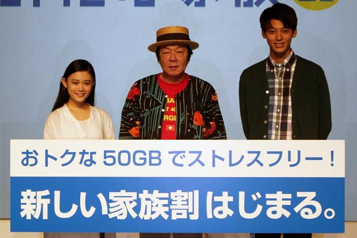 発表会では、10年続いた白戸家のテレビCMに代わり、古田新太さん(写真中央)、竹内涼真さん(写真右)、杉咲花さん(写真左)を迎えた新しい白戸家のメンバーも発表された