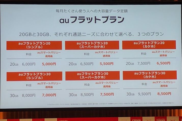 「auフラットプラン」は、月間20GBまたは30GBという大容量のデータ定額プラン。こちらも音声通話料金の違いでそれぞれ3種類のプランから選べる