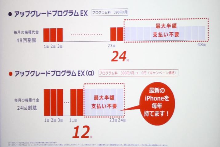 「アップグレードプログラムEX」は、48回の分割払いでの購入を条件に、毎月390円(非課税)のプログラム料を支払うことで、25か月目以降の機種変更時に、端末代金の残債の支払いが不要になるというもの。「アップグレードプログラムEX(a)」は今回新たに追加されたもので、24回の分割払いでの購入を条件に、毎月390円(非課税)のプログラム料を支払うことで、13か月目以降であれば、機種変更時に端末代金の残債の支払いが不要になる。つまり、最大で端末の実質負担金の半分が無性になるというものだ。