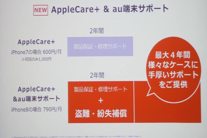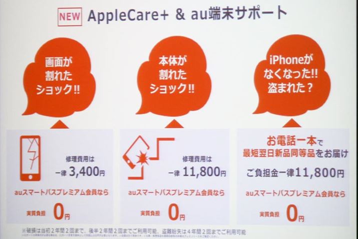 「iPhone」および「iPad」向けの新たな保証メニューも追加された。今回発表された「Apple Care+ & 端末サポート」(税別、月額565〜890円。端末により料金が異なる)は、「Apple Care+」による2年の保証終了後も、同等サービスをauが継続してプラス2年間提供するというものだ。また、新たな保証項目として、自然故障時の保証期間延長やバッテリー無料交換(バッテリー容量が新品の80%未満の場合)に加えて、紛失盗難時にコールセンターに連絡することで新品同様品を最短で翌日に届ける(税別11,800円の料金が必要)サービスが加わっている。修理サービスについては、当初2年間と後半2年間でそれぞれ2回まで、紛失盗難補償については4年間で2回までサポートされる。