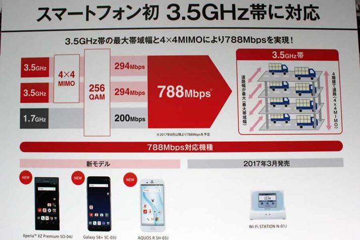 なお、この下り最大788Mbpsの高速通信に対応するスマートフォンは、現状でサムスン「Galaxy S8/ S8+」、ソニー「Xperia XZ Premium」、シャープ「AQUOS R」、モバイルWi-Fiルーターの「Wi-Fi STATION N-01J」のみとなる。「iPhone 8 /8 Plus」や「iPhone X」でも3.5GHz帯は利用可能だが、788Mbpsや738Mbpsの通信には対応していない。