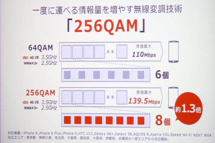 最大590Mbpsから708Mbpsの速度アップには変調方式に256QAMが使われる。従来の64QAMでは6ビットのデータしか載せられなかったが、256QAMでは8ビットのデータを載せることができ、通信速度が33%アップした