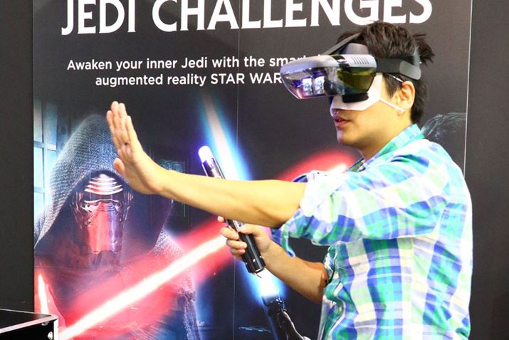 今回CEATECの会場で試せたのは、ライトセーバー・バトル。ライトセーバー・コントローラーを振り回して、カイロ・レンやダース・ベーダー、ダース・モールなど、人気の悪役と戦えるというものだ。Mirage AR ヘッドセットをつけて、ライトセーバー・コントローラーのスイッチを押すと、作中と同じように剣先が伸びて、振るとブーン、ブーンとおなじみのサウンドが耳元で聞こえる。ファンなら、これだけでテンションが上がるはずだ。