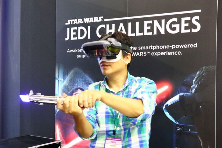 スター・ウォーズ/ジェダイ・チャレンジは、今年9月にドイツで発表されたARを使ったゲームキット。スマートフォンと接続して利用する「Mirage ARヘッドセット」、作中に登場するライトセーバーを模した「ライトセーバー・コントローラー」、プレイヤーの動きを検出する「トラッキング・ビーコン」の3つから構成される。Mirage ARヘッドセットに対応のスマートフォンをセットして利用する。