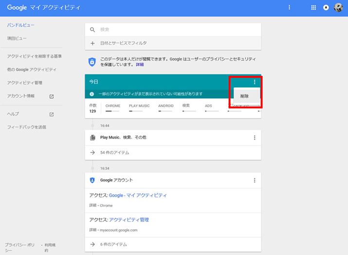 ウインドウ上部のメニューボタンをクリックして「アクティビティを削除する基準」をクリックする
