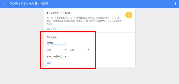 1日分ずつではなく、日付や期間を指定して削除したり、全期間を指定してまとめて削除したりすることも可能。ちなみに、これはGoogleの特定のアカウントの情報を削除しているので、そのGoogleアカウントで使っているスマートフォンなどでも利用履歴は消えて表示されなくなる。