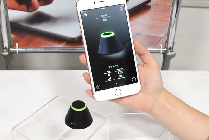 「トレネ」(写真左下)は、パイロンをイメージしたという円錐台の形状を採用する。スマートフォンと本体の通信方式は、Bluetooth 4.1(Bluetooth Low Energy)