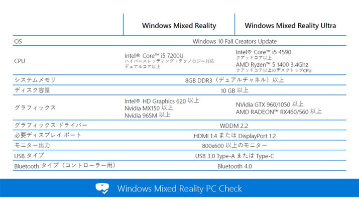 Windows Mixed Realityを楽しむためのパソコンの最小スペックは、CPUがCore i5-7200U以上、メモリーが8GB以上、ディスク容量が10GB以上、グラフィックスが「HD Graphics 620」以上、NVIDIAなら「GeForce MX150/965M」以上と、それほど高性能なパソコンでなくても楽しめる。対応パソコンには「Windows Mixed Reality」マークが付く予定だ。VRでゲームなどを快適に楽しみたいという人は、「Windows Mixed Reality Ultra」マークが付いたモデルを選ぶといい。こちらは外付けグラフィックスなどを備えた高性能なパソコンだ。
