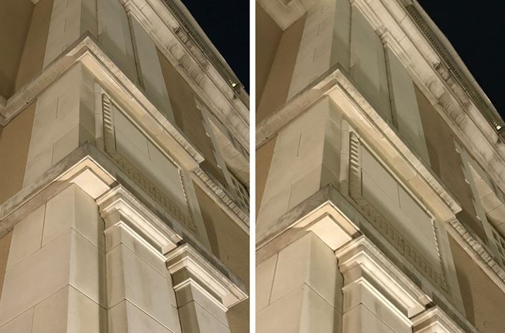 同じ被写体を「2X」をタップしてから撮影した写真。左がiPhone X、右がiPhone 7 Plus。iPhone Xは望遠カメラ、iPhone 7 Plusは広角カメラのデジタルズームが使われている。一見すると、iPhone 7 Plusのほうが明るく撮れているが、デジタルズームなので、よく見ると線がシャープではない。少しだけ暗いが、iPhone Xのほうがきれいだ