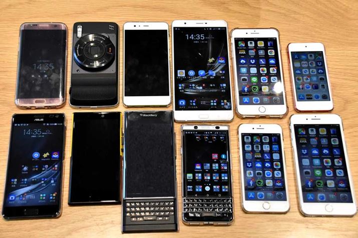 現在、庄司氏が普段使っているモバイル端末。上段左から、「Galaxy S7 edge」(サムスン)、「Moto Z Play+Hasselblad True Zoom」(モトローラ)、「HUAWEI P10 Plus」(ファーウェイ)、「ZenFone 3 Ultra」(ASUS)、「iPhone 8 Plus」(アップル)、「iPod touch(第6世代)」(アップル)。下段左から、「ZenFone AR」(ASUS)、「NuAns NEO [Reloaded]」(トリニティ)、「BlackBerry Priv」(ブラックベリー)、「Blackberry KEYone」(ブラックベリー)、「iPhone 7」(アップル)、「iPhone 7 Plus」(アップル)