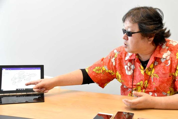 手書きの相関図を説明する庄司氏。使っているのは、物理キーボードを廃止した斬新な2in1タブレット「YOGA BOOK」(レノボ・ジャパン)だ