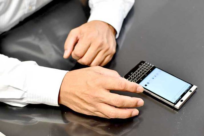 前回のインタビュー取材で増井氏は、物理キーボードを搭載したAndroidスマートフォン「BlackBerry KEYone」を例に、モバイル端末におけるキーボードの必要を強調していた(※写真は増井氏取材時のもの)