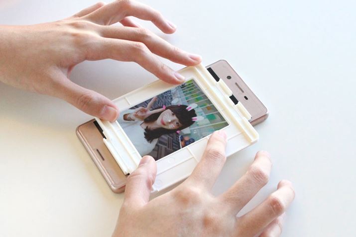 このフレームに入る範囲が、チェキに写る部分です。粘着テープが付いているので、フレームを裏返してスマホの画面に貼り付けます。