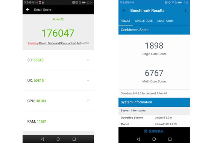 「AnTuTu Benchmark」のスコアは“176047”、「Geekbench 4」のスコアはシングルコアが“1898”、マルチコアが“6767”という結果