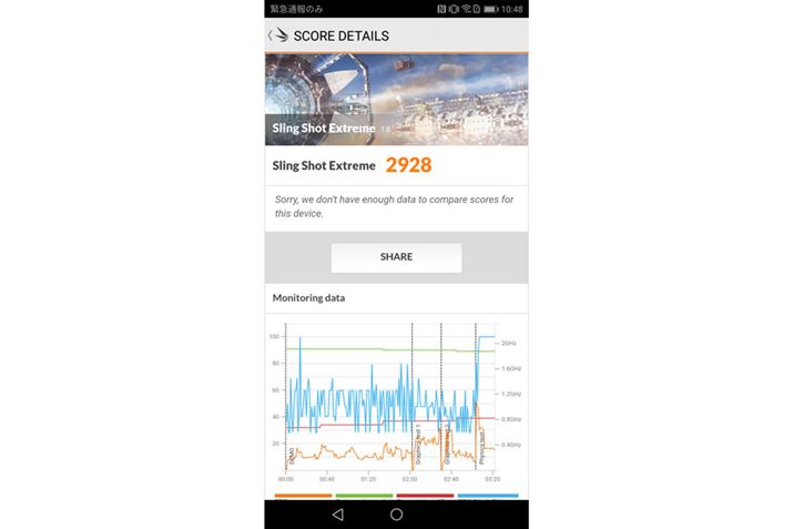 3D性能を測る「3DMark」の「Sling Shot Extreme」のスコアは“2928”。これなら3Dをバリバリ使用するゲームも難なくプレイできるだろう