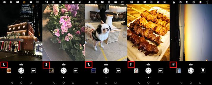 カメラが被写体を認識すると、左下にそれぞれの撮影モードを示すアイコンが表示される(左から夜景、花、犬、フード、日の入り)。被写体や撮影シーンに合わせて撮影モードを手動で切り替える必要はない