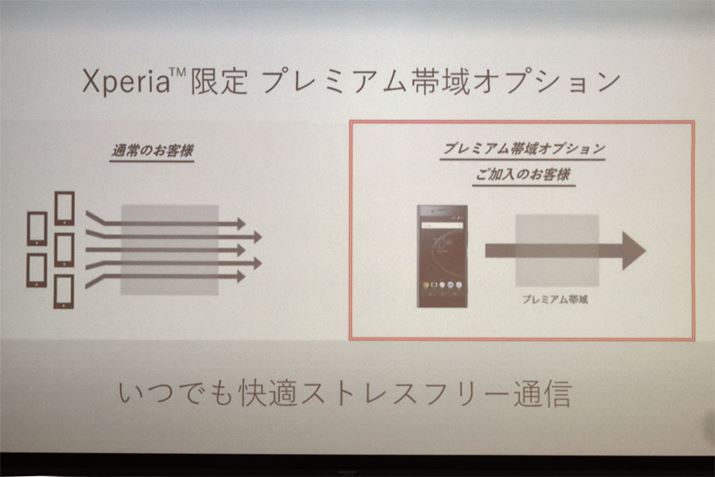今回の新オプション「プレミアム帯域オプション」は、アップロード・ダウンロードともに専用帯域を利用し、快適で安定した通信が楽しめる、「Xperia XZ Premium」専用のサービスとなる。