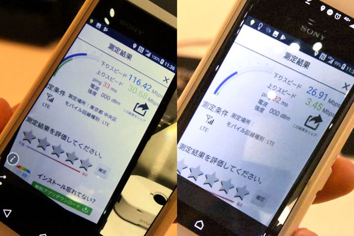 通信速度測定システム「RBB SPEED TEST」により測定した通信速度の結果。左が「プレミアム帯域オプション」対応の「Xperia XZ Premium」、右が非対応の同端末だ。同社のスタッフが東京・銀座で測定したものではあるが、通信速度では下りも上りも「プレミアム帯域オプション」対応端末のほうが圧倒的に上回っていることがわかる