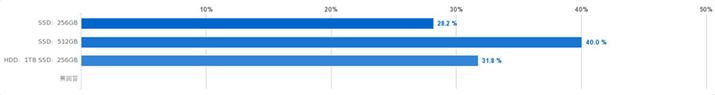 選択肢は3種類。「SSD 256GB」「SSD 512GB」「SSD 256GB+HDD 1TB(デュアルドライブ)」と、いずれもSSDの搭載は必須と考えた選択肢を用意しました。結果としてもっとも多かったのは、「SSD 512GB」(40.0%)。やはりここでも、速さと容量のいずれもトップクラスの「SSD 512GB」を選択したいという、ハイエンド志向が見て取れます。速さと容量のバランスを取ったデュアルドライブ構成も31.8%と健闘しましたが、最近は、クラウドストレージを利用するケースも増えてきており、内蔵ストレージにさほどの大容量は不要と感じている人も多いのかもしれません。