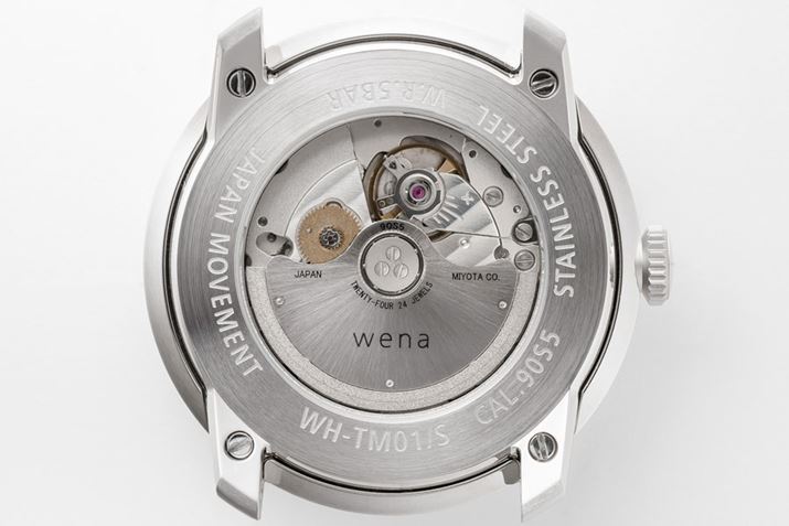 キャリバーは、高品質な機械式ムーブメント「90S5」を採用。錘(おもり)には「wena」のロゴを施している。また、重心を低くすることで腕にフィットする着け心地を実現したという