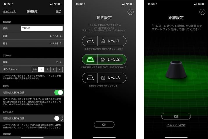 左が設定画面。音量やLEDパターンなどが変更できる。中央の「動き設定」画面では、アラームが作動する振動の強度を3段階から選べる。右の「距離設定」画面では、「トレネ」が警戒状態になるユーザーとの距離を決められる